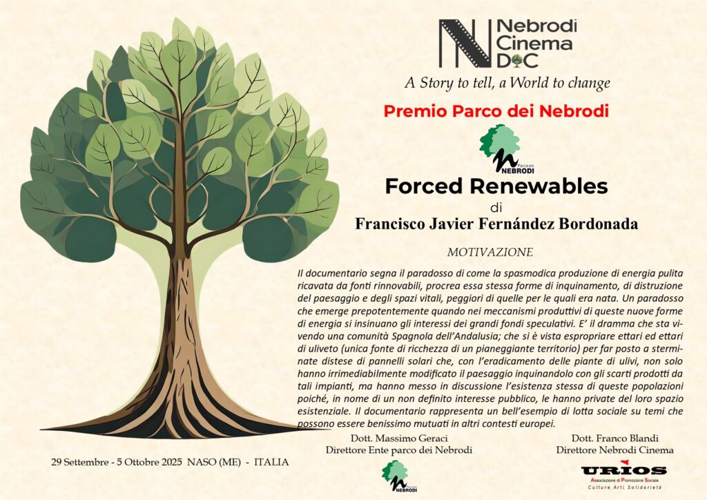 “Renovables Forzosas” ha ganado el Premio Parco dei Nebrodi en Naso, (Messina) en Sicilia en el prestigioso Festival Internacional Nebrodi Cinema DOC y en el que han inscrito y participado 316 películas de 50 países. El ganador del premio absoluto, ha sido Mauricio Albornoz Iniesta por su película “Una Canción para mi tierra”. Para nosotros es una gran honor haber podido ser finalistas y premiados además de haber podido participar en este maravilloso festival que trata a través de la educación y concienciación de la sociedad, no mirar a otro lado y afrontar los problemas y temas urgentes y cruciales en relación con el hombre y el medioambiente.